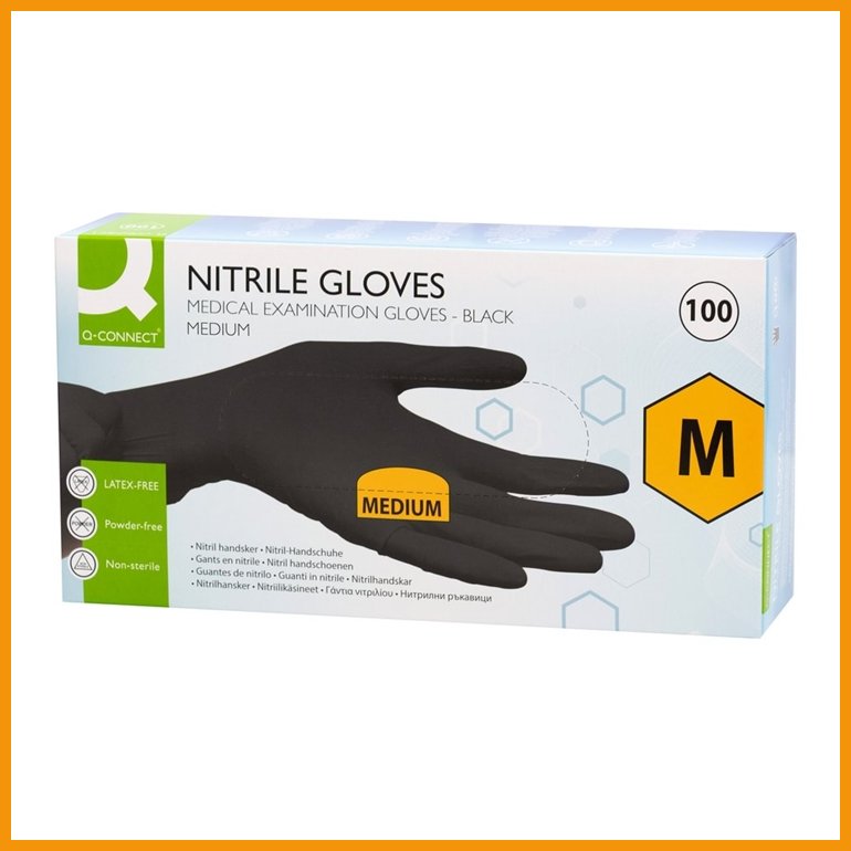 Q-CONNECTin puuteriton ja tehdaspuhdas musta nitriilikäsine on vahva ja joustava. Elintarviketurvallisessa nitriilikäsineessä on hyvän otteen takaava pinta. Lateksiton käsine soveltuu myös lateksia allergisille.Koko: M