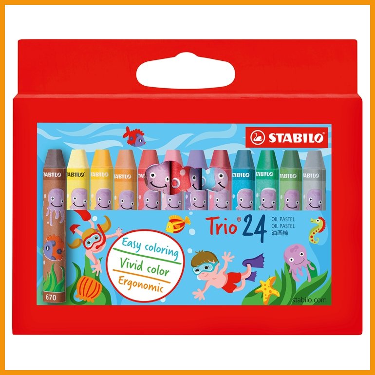 STABILO Trio 2624 on ergonomisella kolmikulmaisella rungolla varustettu öljypastelliliitu yli 3-vuotiaille. Myrkyttömän liidun kirkkaat sävyt tuottava väriaine sekoittuu helposti ja on sekä veden- että valonkestävää.Liidun mitat: 65 x 9 mm
