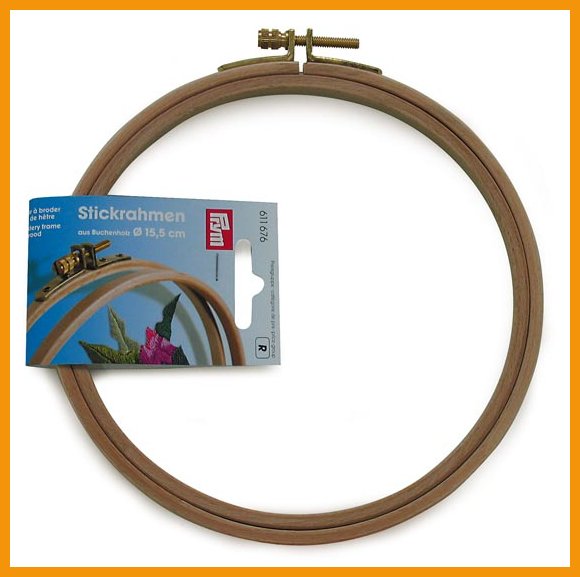 Puinen ompelukehys. Halkaisija 15,5 cm.