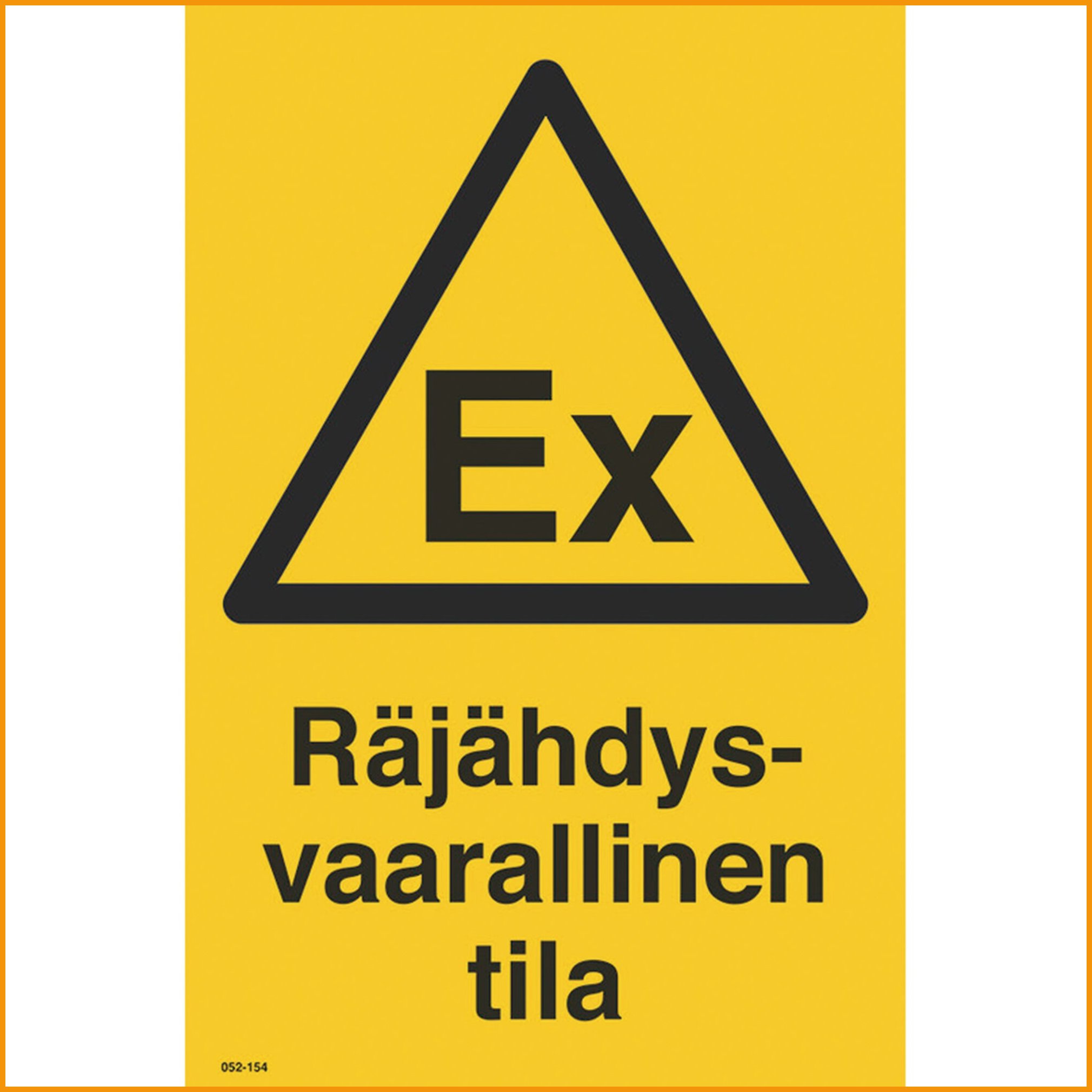 Varoitusmerkki ”räjähdysvaarallinen tila”-tekstillä ja symbolilla - varoitusmerkit on tärkeä asettaa näkyvälle paikalle, jotta katsoja ehtii reagoida varoitukseen - varoituskilpien keltainen väri herättää huomion, tekstit ja symbolit tehostavat viestintää - 1 mm tarroitettu muovikilpi - mitat 20 x 30 cm myyntierä 1.Opaste ex räjähdysvaarallinen tila on korkealaatuinen huomiokyltti, jonka verkkokaupan tilauksen toimitus kestää 1-2 päivää. Muistathan, että Toimitus on ilmainen kaikilla verkkokaupan ostoksilla, joiden hinta on yli 140 €. Meiltä voit tilata laskulla ja ilman rekisteröitymistä.