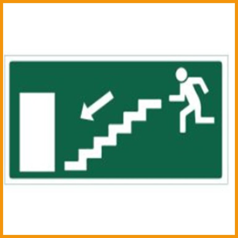 Opastekyltti poistumistie portaat alas vasen on korkeatasoinen huomiokyltti, jonka toimituksen kesto on verkkokaupasta tilattuna 1-2 päivää.