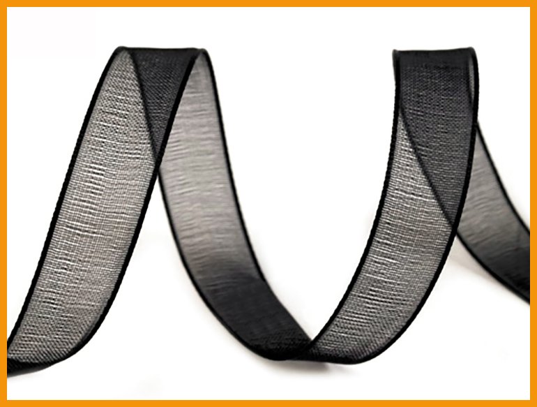 Kaunis läpikuultava koristenauha. Väri musta. 9mm x 25m. Polyesteriä.