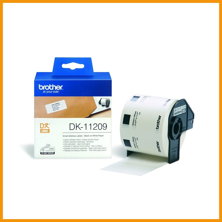 Brother DK-11209 on valmiiksi muotoiltu paperinen osoitetarra soveltuviin Brother-tarratulostimiin. Osoitetietojen lisäksi voit tulostaa tarroihin yrityksen logon, viivakoodin tai muuta lähetykseen liittyvää tietoa.Tarran mitat: 29 x 62 mm