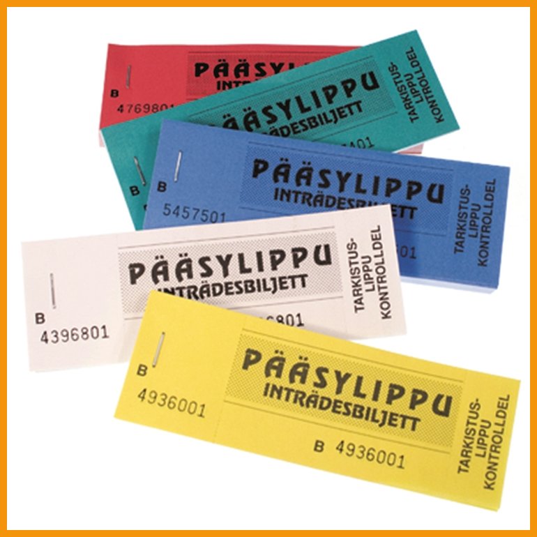 Suomessa valmistettu numeroitu pääsylippuvihko kaikenlaisten tapahtumanjärjestäjien tarpeisiin. Yhdessä niteessä on 100 numeroitua pääsylippua.Värit: punainen, sininen, vihreä, keltainen ja valkoinen.