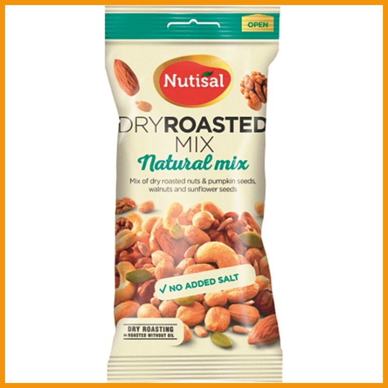 Nutisal Dry Roasted Natural Mix on herkullinen sekoitus paahdettuja ja suolaamattomia pähkinöitä ja siemeniä. Gluteeniton ja laktoositon sekoitus sopii niin naposteltavaksi kuin välipalaksikin. Pussissa on cashew-, maa-, saksan- ja hasselpähkinöitä, manteleita ja auringonkukan- ja kurpitsansiemeniä.Sisältö: 60 g