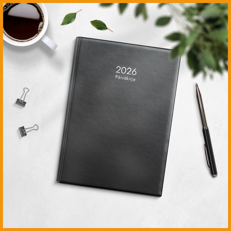 Päiväkirja 2026 Kalenteri musta muovikansi parikierresidottu on hyvä kalenteritarvike, jonka toimituksen kesto on verkkokaupasta tilattuna 1-2 päivää. Huomaa, että toimitus on ilmainen yli 140 € hintaisille verkkokauppa ostoksille! Meiltä voit tilata laskulla ja ilman rekisteröitymistä.