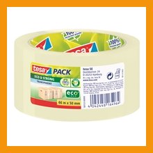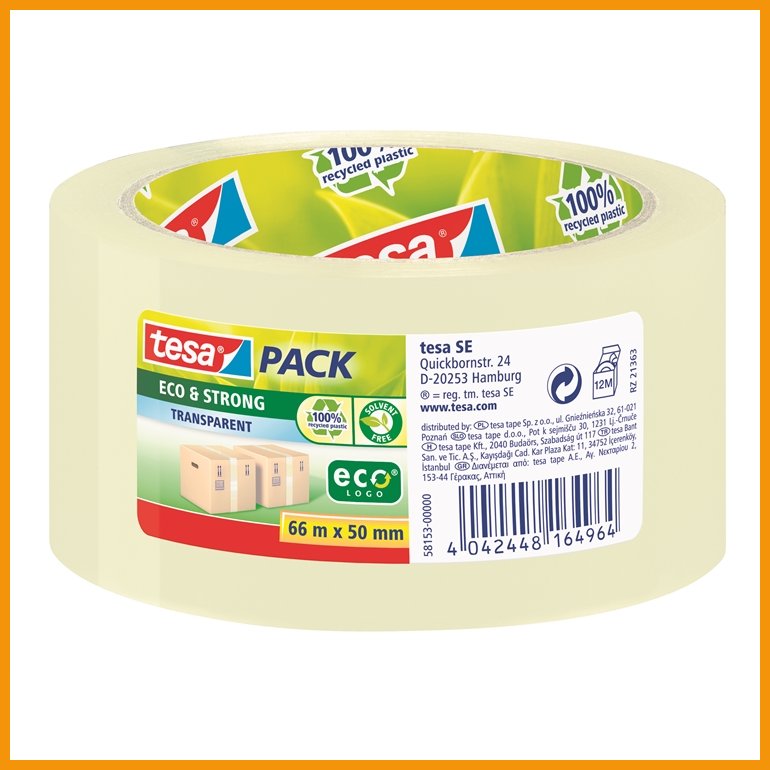 Tesapack eco & strong on 100-prosenttisesti kierrätysmuovista valmistettu pakkausteippi, joka ei sisällä PVC:tä eikä liuotteita. Pakkausteipin tausta on PP-muovia, keskiö kierrätyskartonkia ja liima liuotteetonta. Äänettömästi rullalta kelautuva pakkausteippi kestää hyvin UV-säteilyä ja tarttuu lujasti lähes kaikenlaisiin pakkausmateriaaleihin.Rullan pakkausteipin mitat: 50 mm x 66 m
