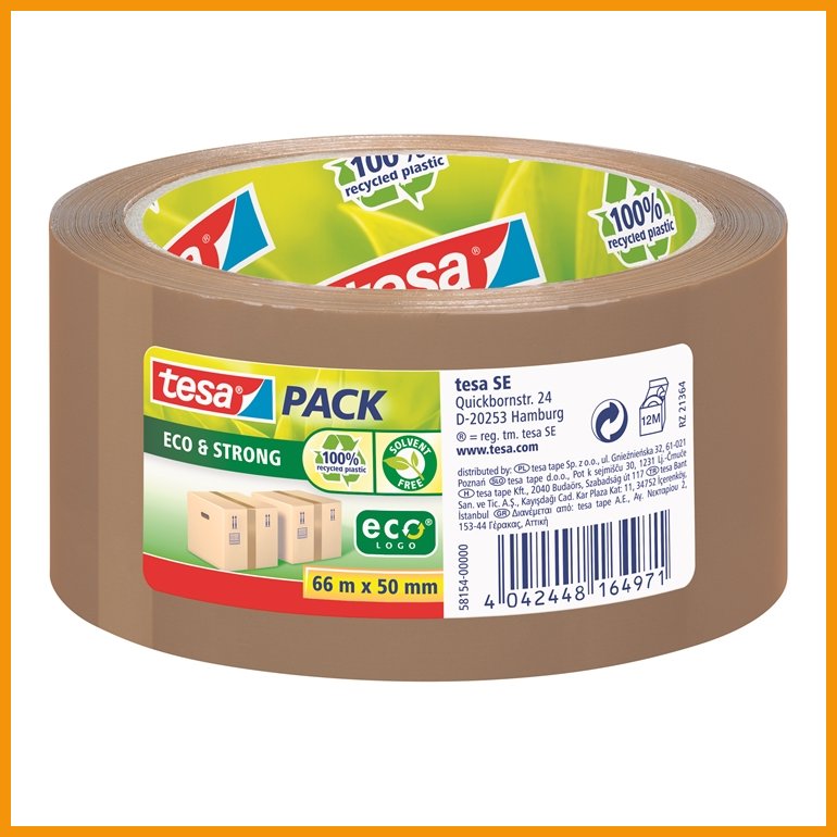 Tesapack eco & strong on 100-prosenttisesti kierrätysmuovista valmistettu pakkausteippi, joka ei sisällä PVC:tä eikä liuotteita. Pakkausteipin tausta on PP-muovia, keskiö kierrätyskartonkia ja liima liuotteetonta. Äänettömästi rullalta kelautuva pakkausteippi kestää hyvin UV-säteilyä ja tarttuu lujasti lähes kaikenlaisiin pakkausmateriaaleihin.Rullan pakkausteipin mitat: 50 mm x 66 m