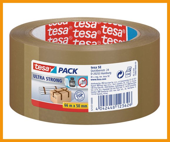 Tesapack ultra strong on hiljaisesti ja tasaisesti rullalta kelautuva PVC-muovinen pakkausteippi erittäin hyvin tarttuvalla luonnonkumiliimalla. Repeytymistä kestävä pakkausteippi soveltuu raskaan tavaran pakkaamiseen ja muuhun vaativaan käyttöön, jossa tarvitaan erittäin pitävää sulkemista.Rullan pakkausteipin mitat: 50 mm x 66 m