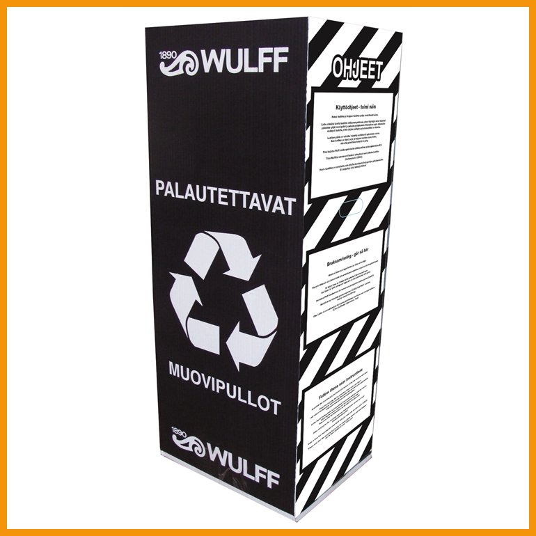 Wulffin tyylikäs ja isokokoinen palautuslaatikko tyhjille muovipulloille ja kennoille. HUOM! Ei sovellu tölkeille. Laatikkoon mahtuu jopa 96 kpl 0,5 l muovipulloa ja 4 kennoa. Toimitamme pullot Palpa:lle uusiokäyttöön, palautusohjeet löydät laatikon kyljestä.