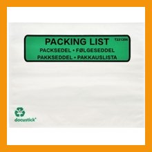Docustick Green on muoviton ja kierrätettävä tasku lähetyslistojen suojaksi lähetyksiin, jotka eivät vaadi säänkestävyyttä. Paperista ja liimasta valmistettu tasku kiinnitetään laatikon pintaan, josta se on helppo lukea.Pitkältä sivulta avonaisessa taskussa on teksti PAKKAUSLISTA.