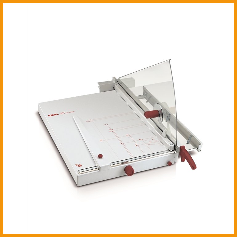 Ideal 1171 on käsikäyttöinen paperileikkuri erittäin suurillekin arkeille. Pöytään on merkitty vakiokoot A6-A3. GS-turvallisuustestatussa ja helppokäyttöisessä leikkurissa on tuuma- ja millimetriasteikoilla varustettu sivukohdistin, portaattomasti säädettävät leikkuu- ja etukohdistin sekä mittalukitus.Leikkuuleveys: 710 mm