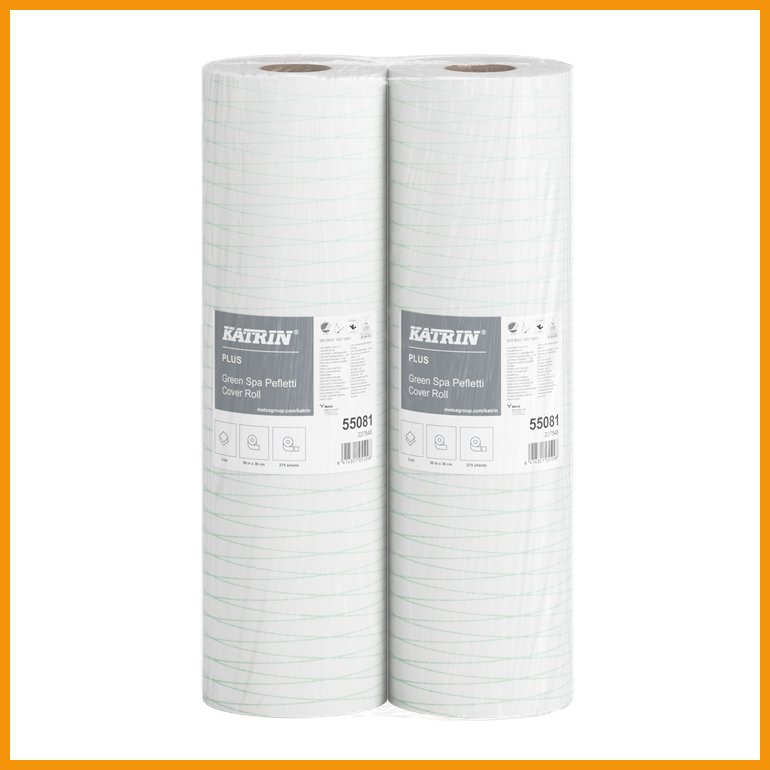 Katrin Green Spa Cover Roll on maailman ensimmäinen täysin muoviton pefletti. Vettähylkivä ja kaksinkertainen pefletti on valmistettu 100 % sellusta. Valmiiksi perforoidusta rullasta on helppo repäistä arkki.Suomessa valmistetulla tuotteella on sekä EU Ecolabel -ympäristösertifikaatti että pohjoismainen Joutsenmerkki.