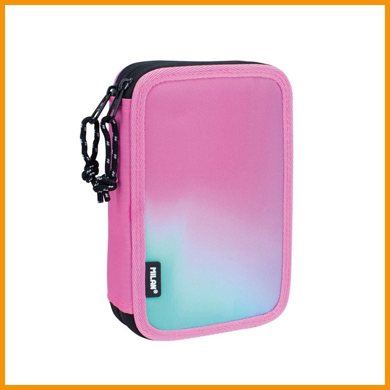 Penaali MILAN Sunset pinkki on täytetty kaksikerroksinen koulupenaali, joka pitää koulutarvikkeet hyvässä järjestyksessä ja helposti saatavilla. Vetoketju on varustettu narullisella vetimellä. Penaali sisältää monipuolisen valikoiman koulutarvikkeita: 2 pyyhekumia, AFILA-teroitin, HB-lyijykynä, sinimusteinen COMPACT Sunset -kuulakärkikynä, 15 cm kolmiomainen viivoitin, 12 kolmikulmaista värikynää ja 18 huopakynää. Penaalin ulkopinta on valmistettu ripstop-kankaasta, joka on kevyt ja hyvin kestävä: kangas sisältää vahvikekuituja, jotk a on kudottu ristikkäin.Materiaali: polyesteri (ulkopinta ja vuori)