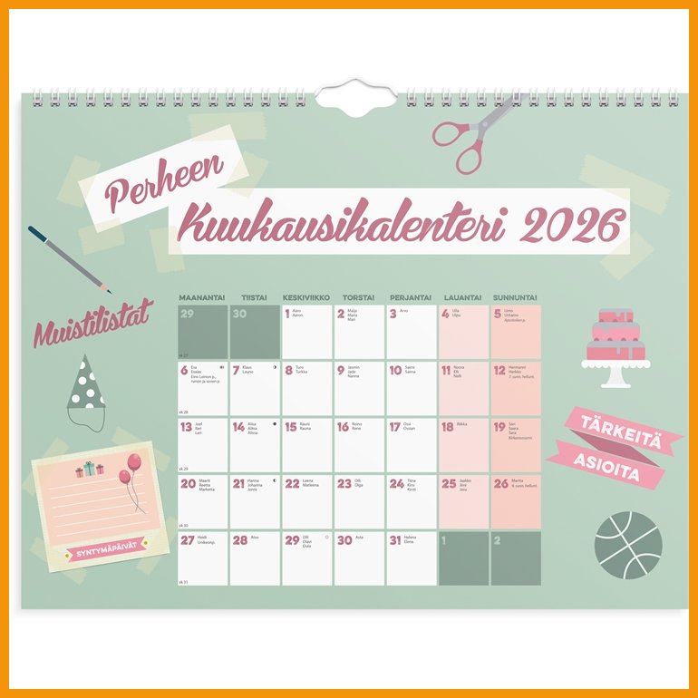 Perhekalenteri 2026 Perheen kuukausikalenteri on upea kalenteritarvike, jonka verkkokauppatilauksen toimitus perille kestää 1-2 päivää. Muistathan, että hinnaltaan yli 140 € verkkokauppatilaus toimitetaan aina ilmaiseksi! Meiltä voit tilata laskulla ja ilman rekisteröitymistä.