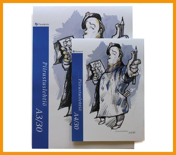 Paperipisteen kotimaisessa piirustuslehtiössä on blanko valkoinen paperi.Mitat: A4