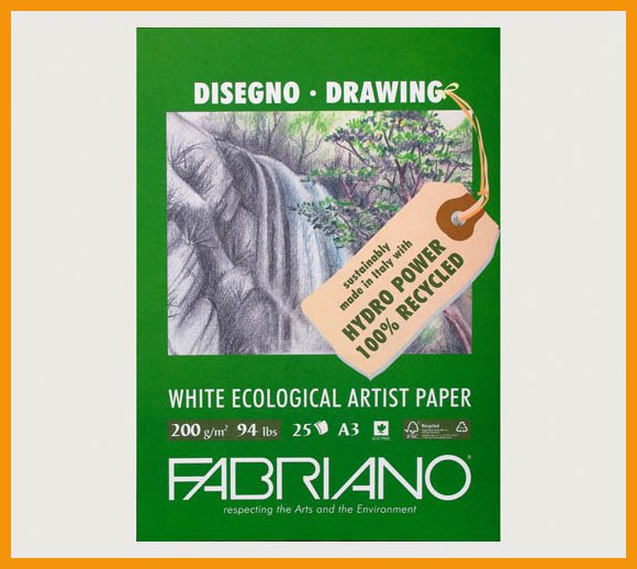 Fabrianon valkoinen piirustuspaperi on happovapaata ja valmistettu 100-prosenttisesti kierrätyspaperista. Vahva paperi soveltuu mm. luonnosteluun ja piirtämiseen niin kynällä, hiilellä, liidulla ja värikynillä kuin tusseillakin.Ympäristöystävällisellä tuotteella on FSC-ympäristösertifikaatti.