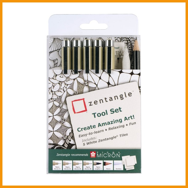 12-osaisessa Sakura Zentangle -piirustussarjassa on kaikki tarvittava rentouttavan zentangle-harrastuksen aloittamiseen: neljä Pigma Micron -kuitukärkikynää, Pigma Graphic -kalligrafiakynä, Zentangle Bruynzeel -lyijykynä, Bruynzeel Tortillon -stomppi ja viisi Zentangle ATC -korttia.
