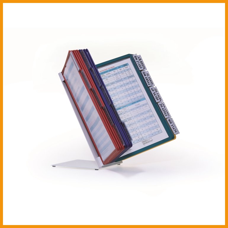 Durable Vario -pikahakuteline on käytännöllinen tapa monenlaisten materiaalien esillepanoon. Käyttövalmis, pöydälle asetettava teline on hyvässä katselukulmassa ja pysyy vakaasti paikallaan metallijalustansa päällä. Sivupysäyttimet tukevat taskuja antamatta niiden repsahtaa alas. Mukana on 20 mustareunaista ja heijastamatonta Durable Sherpa -taskua etikettikielekkeillä.Mitat: 460 x 405 x 370 mm