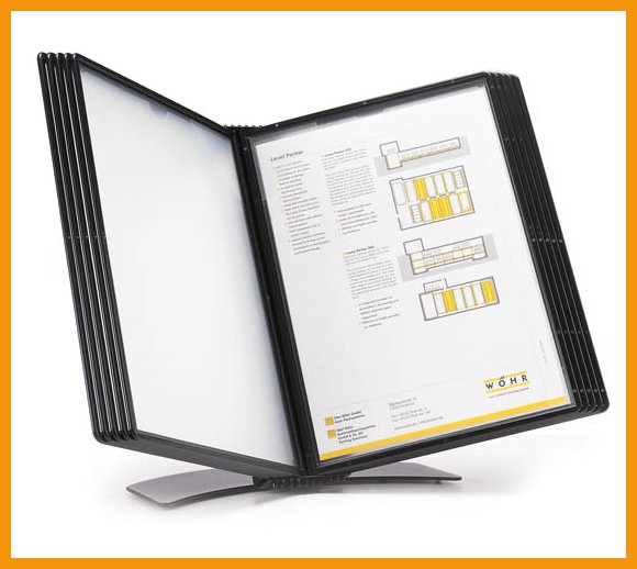 Probeco Easymount -pikahakuteline on elegantti ja käytännöllinen tapa monenlaisten materiaalien esillepanoon. Pöydälle asetettava teline pysyy vakaasti paikallaan metallijalustansa päällä. Telineessä on paikat 10 taskulle.Taskut on tilattava erikseen koodeilla 62056 (musta), 62053 (punainen), 62054 (sininen), 63137 (värilajitelma) ja 62055 (valkoinen).
