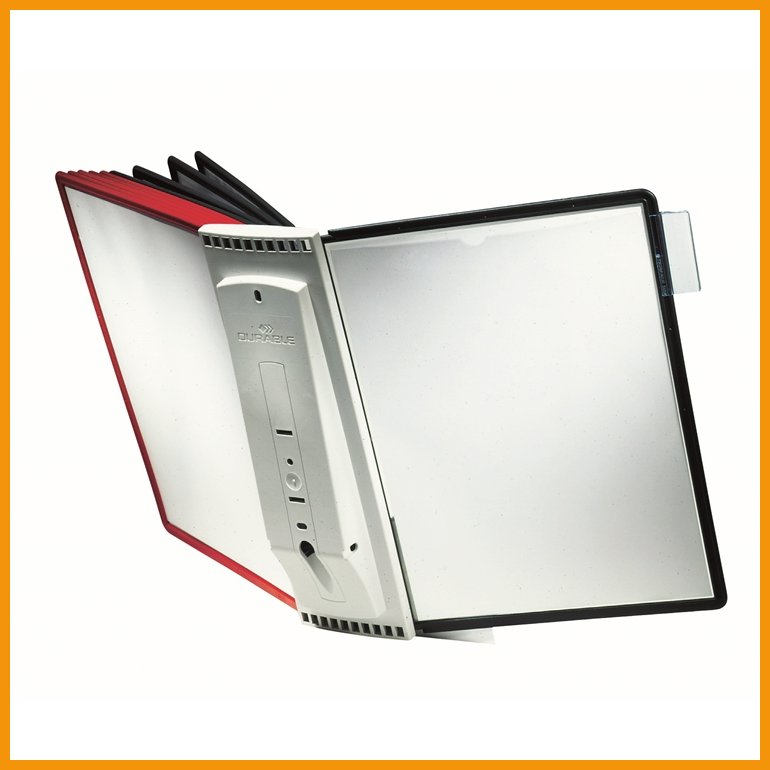 Durable Sherpa -pikahakuteline on käytännöllinen tapa monenlaisten materiaalien esillepanoon. Seinään asennettavan telineen sivupysäyttimet tukevat taskuja antamatta niiden repsahtaa alas.Mukana tulee 10 etiketeillä ja kielekkeillä varustettua, heijastamatonta Durable Sherpa -pikahakutaskua, joista puolet musta- ja puolet punareunaisia.