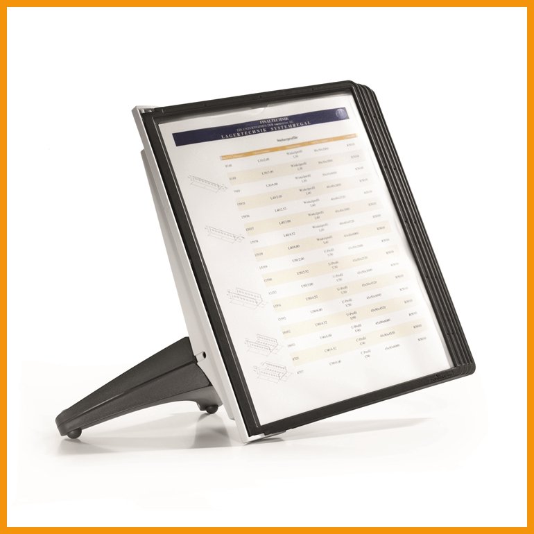 Durable Soho -pikahakuteline on käytännöllinen tapa monenlaisten materiaalien esillepanoon. Käyttövalmis, pöydälle asetettava teline on hyvässä katselukulmassa ja pysyy vakaasti paikallaan muovijalustansa päällä. Sivupysäyttimet tukevat taskuja antamatta niiden repsahtaa alas. Mukana tulee 5 mustareunaista ja heijastamatonta Durable Sherpa -taskua etikettikielekkeillä.Mitat: 480 x 385 x 380 mm