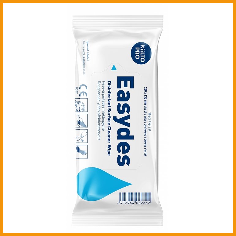 Kiilto Pro Easydes on mikrobisidisesti tehokas, käyttövalmis ja nopeavaikutteinen desinfektiopyyhe alkoholeja sietäville ei-invasiivisille lääkinnällisille laitteille. Etanolipohjainen, tutkitusti tehokas ja nukkaamaton pyyhe on CE-merkitty lääkinnällinen laite, luokka II a, NB 0537.Easydes poistaa hyvin lian ja rasvan sekä tuhoaa tehokkaasti bakteerit, virukset ja fungit. Aine saavuttaa desinfektiotehon myös näkyvästi kontaminoituneilla pinnoilla. Tuotteen mikrobisidinen teho on tutkittu: N16615 30 kpl desinfektiopyyhkeelle (16 kpl desinfektiopyyhkeelle EN16615 testin läpäisee S. aureus, P. aeruginosa ja C.albicans). Lisäksi Easydes Pesevän pintadesinfektioaineen tutkimustieto: EN 13727 (bakteerit), EN 13624 (hiivat), EN 14348 (tuberkuloosi ja mykobakteerit), EN 14476 (adeno- ja norovirus), EN 14561 (bakteerit), EN 14562 (hiivat, homeet), EN 14563 (mykobakteerit ja tuberkuloosi).