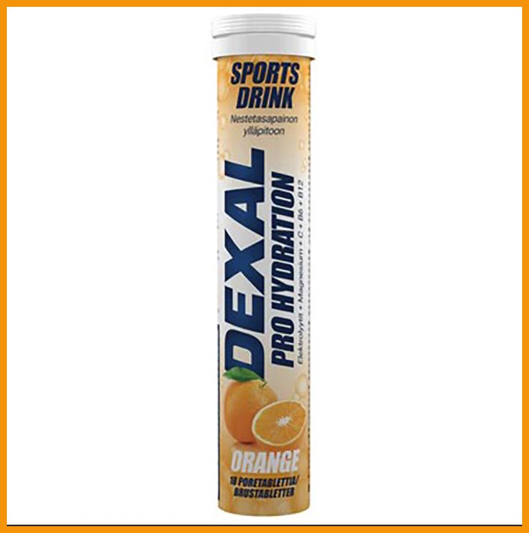 Dexal Pro Hydration Appelsiini -poretabletti liuotetaan puoleen litraan vettä, jolloin syntyy kaloriton ja sokeriton urheilujuoma. Urheilujuoman nauttiminen auttaa korvaamaan kehon hikoillessa kadottamia nesteitä ja elektrolyyttejä. Katso ainesosaluettelo Seloste-välilehden Tuotetiedot-linkistä.Putkilossa on 18 poretablettia.