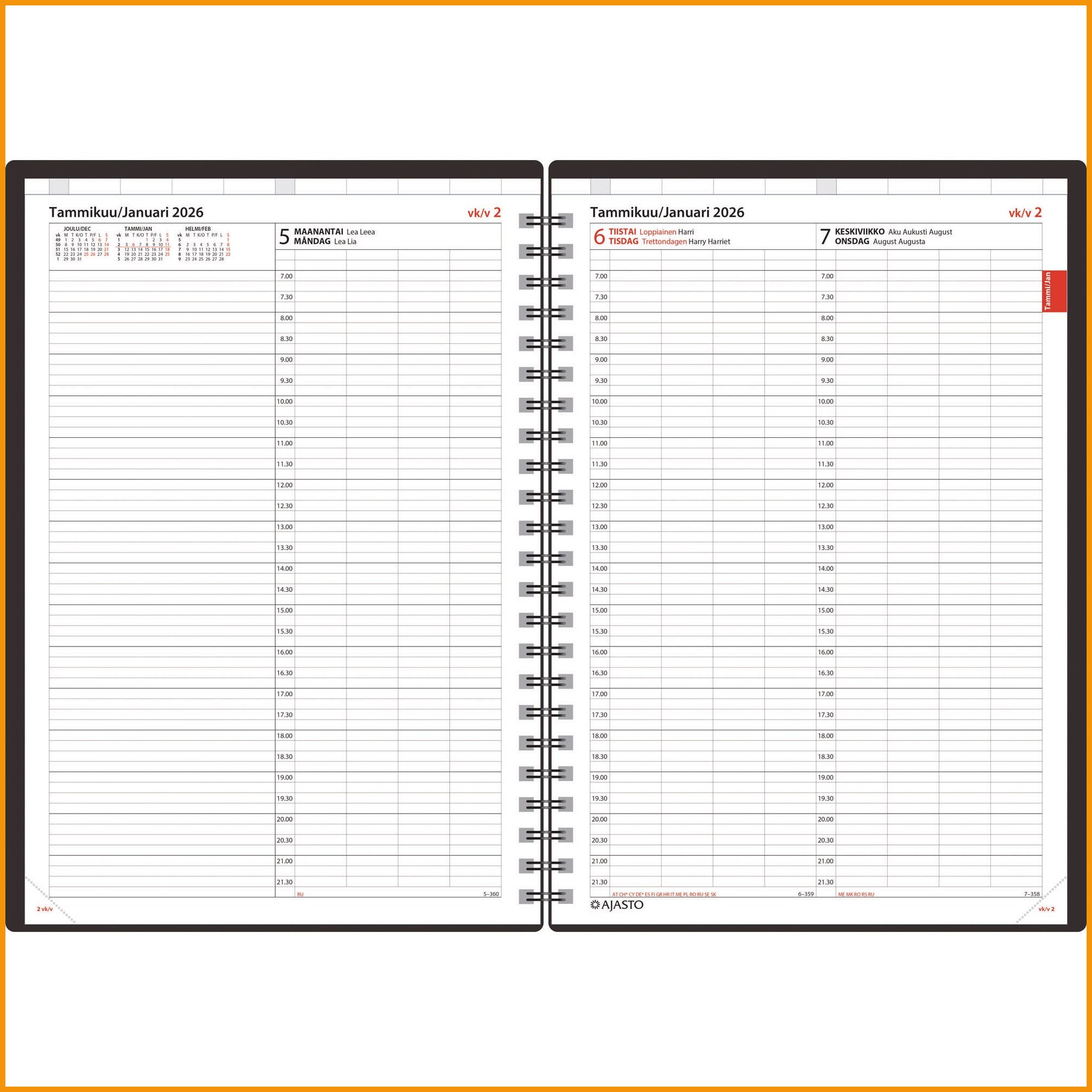 Ajasto Ajanvaraus 2026 pöytäkalenteri on A4-kokoinen tukeva ajanvarauskalenteri ammattilaisille. Parikierresidottu kalenteri on helppo käyttää ja käsitellä. Kalenteri näyttää viikon kahdella aukeamalla, jotta päiväkohtaisesti varausmerkinnöille jää reilusti tilaa. Kalenteriin on merkitty kellonajat puolen tunnin välein, alkaen seitsemästä aamulla ja päättyen puoli kymmeneen illalla. Ajasto Ajanvaraus 2026 tärkeimmät ominaisuudet: koko 210 x 297 mm (A4) parikierresidottu viikko kahdella aukeamalla vuosisuunnitelmat 2026 ja 2027 kalenteritaulukot vuosille 2026–2030 takana esiin taitettava vuoden 2026 taulukkokalenteri Suomen kartta FSC®-sertifioitu tuote kielisyys suomi ja ruotsi Ajasto-kalenterit ovat pääosin kotimaista tuotantoa. Kalentereiden suunnittelussa muiden muassa ekologisuus ja laatu ovat tärkeässä asemassa. Ajasto Ajanvaraus 2026 -pöytäkalenteri parikierresidottu painetaan sertifioidulle paperille. Sertifioidulla FSC-paperilla olet mukana edistämässä vastuullista metsänhoitoa. Kalentereilla ei ole vaihto- eikä palautusoikeutta.