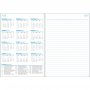 Arkkien väri on pöytäkalenterissa kirkkaan valkoinen ja keinonahasta valmistetun kannen väri on sininen. Kalenterin arkkien sidonta tapa on ommel. Pöytäkalenterin koko on A5. Edullisen pöytäkalenterin ajanjakso kattaa kalenterivuoden tammikuusta joulukuuhun (12 kk). Kalenterissa on yhdellä aukeamalla aina yksi viikko. Kellonajat on kalenterissa esitetty yhden tunnin välein.Pöytäkalenterit ja päiväkirjat tuotteiden toimitustiedot