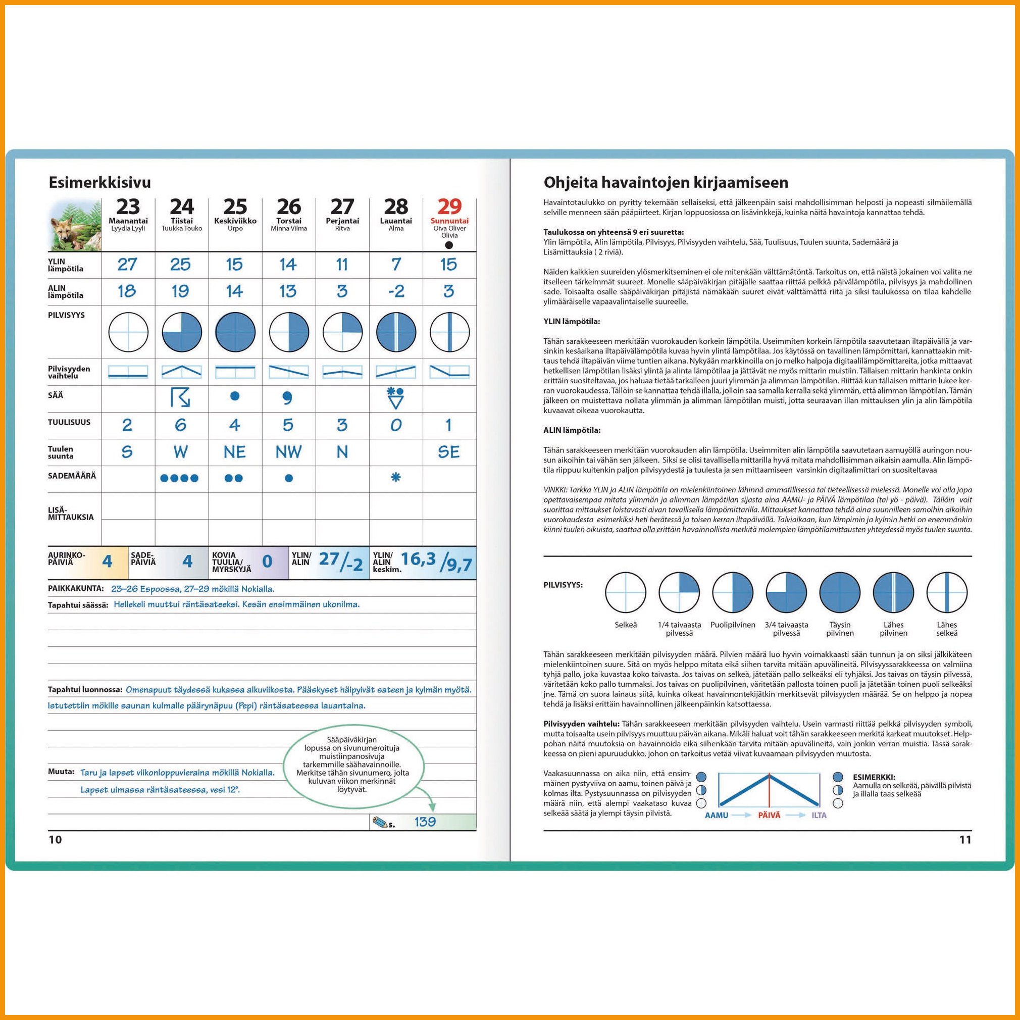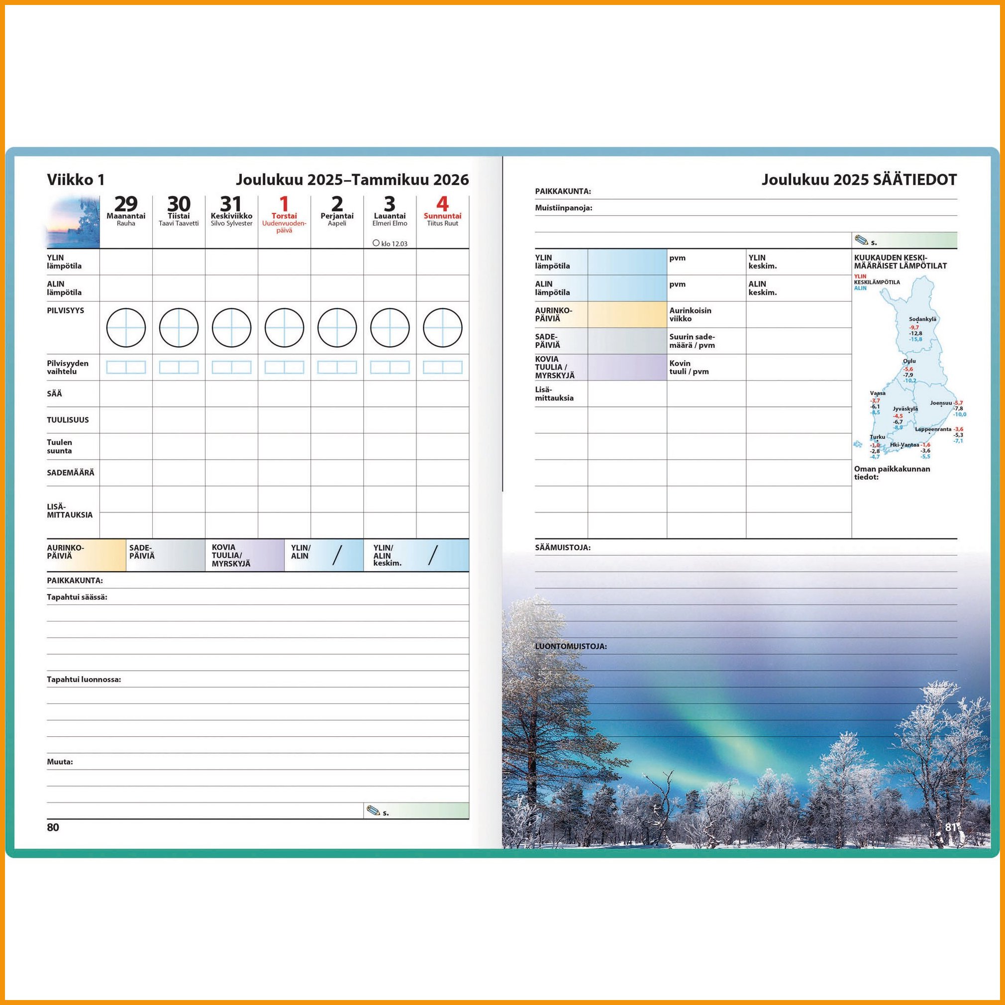 Ajasto Säävuosi 2026 on pöytäkalenteri sinulle, joka seuraat päivittäin säätä ja haluat tehdä säästä päiväkohtaisia merkintöjä. Säävuosi-kalenteri näyttää aukeaman toisella sivulla täyden viikon. Jokaisella päivällä on valmiina rivejä, joille voit merkitä esimerkiksi päivän lämpötilat, tuulisuuden ja sademäärän sekä paljon muuta. Aukeaman toisella sivulla on sään kuukausiseuranta erilaisten havaintojen merkitsemiseen. Sääkalenteri sisältää myös runsaasti hyödyllistä tietoa säähän liittyen. Ajasto Säävuosi 2026 tärkeimmät ominaisuudet: koko 148 x 210 mm (A5) laminoidut kannet runsaasti numeroituja muistiinpanosivuja aukeamalla viikkonäkymä kompakti paketti perussäätietoa eri vuodenaikoina, vihjeitä sääntarkkailuun kaksi lukunauhaa FSC®-serfifioitu tuote Ajasto-kalenterit ovat pääosin kotimaista tuotantoa. Kalentereiden suunnittelussa muiden muassa ekologisuus ja laatu ovat tärkeässä asemassa. Ajasto Säävuosi 2026 pöytäkalenteri painetaan sertifioidulle paperille. Sertifioidulla FSC-paperilla olet mukana edistämässä vastuullista metsänhoitoa. Kalentereilla ei ole vaihto- eikä palautusoikeutta.