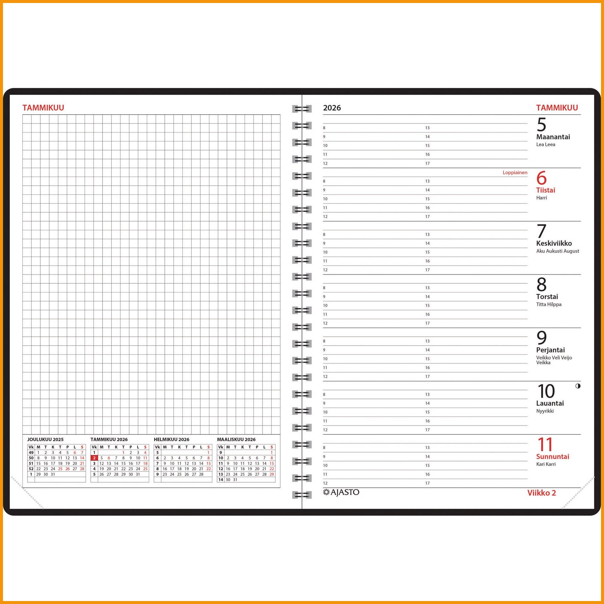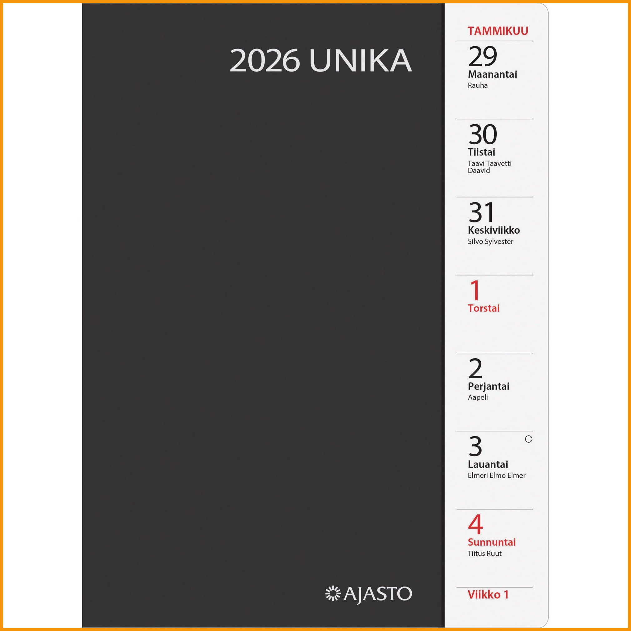 Pöytäkalenteri 2026 Ajasto unika musta 148 x 210mm tuotetiedot