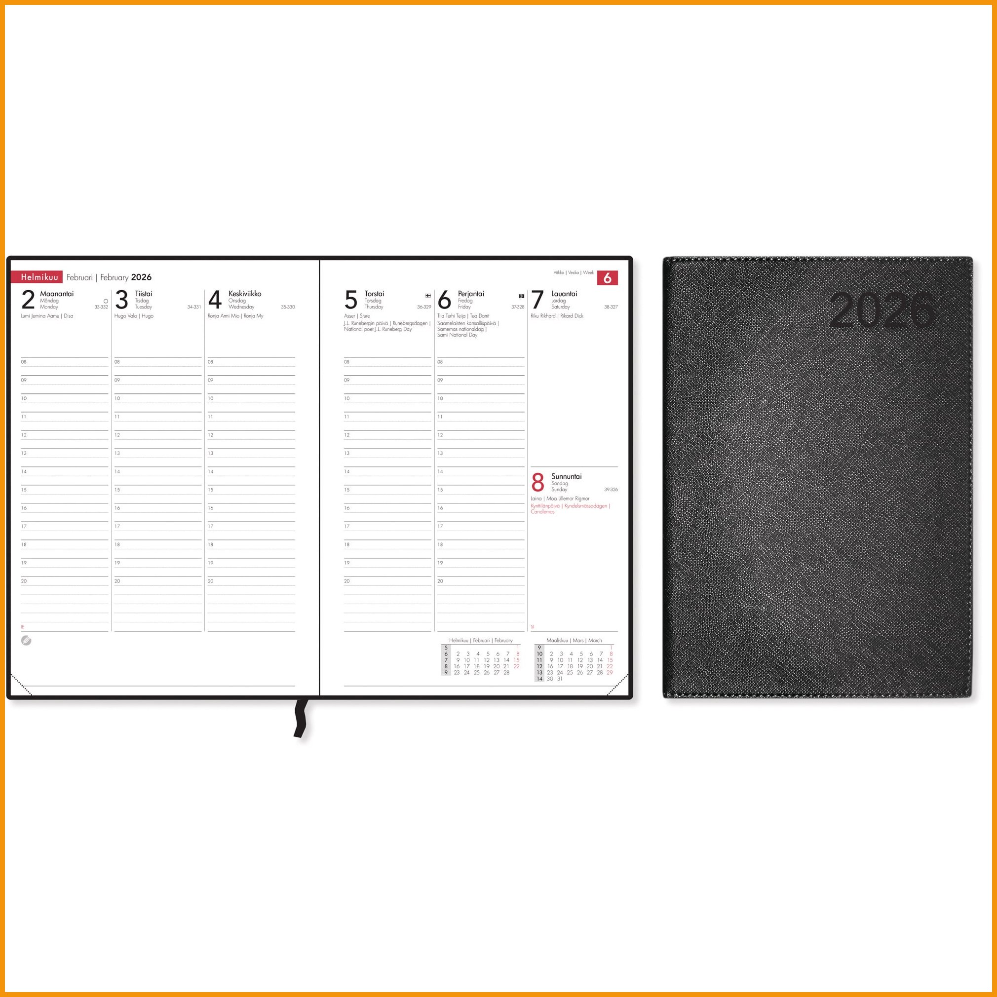 Ympäristöystävällinen FSC sertifioitu pöytäkalenteri. Pöytäkalenterin arkit ovat kirkkaan valkoisia ja keinonahasta valmistetun kannen väri on musta. Kalenterin arkkien sidonta tapa on ommel. Jokaisella kalenterin aukeamalla on aina 1 viikko. Kellonajat on pöytäkalenterissa esitetty 60 minuutin välein. Pöytäkalenteri on kooltaan A5.Pöytäkalenterit ja päiväkirjat tuotteiden toimitustiedot