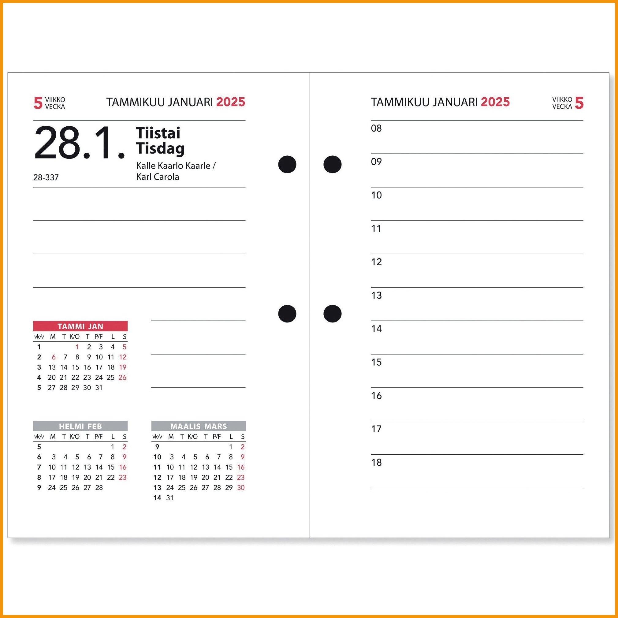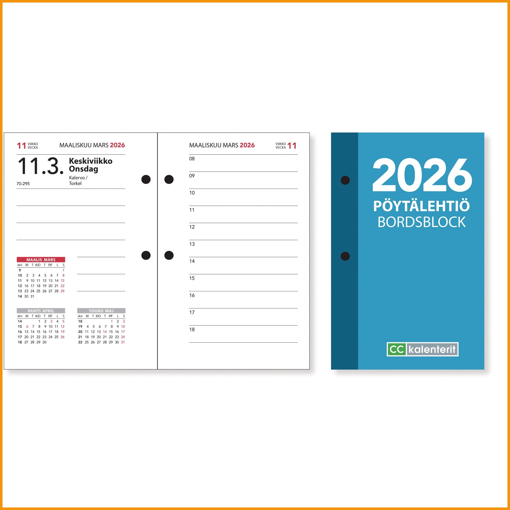 CC 2606 Pöytälehtiö 2026 – perinteinen toimiston pöytäkalenteri CC 2606 Pöytälehtiö 2026 on klassinen ja käytännöllinen pöytäkalenteri, joka on ollut toimistojen luottovalinta jo vuosikymmeniä. Standardikokoinen, kaksireikäinen kalenteri sopii myös muiden valmistajien alustoihin. Päivä näkyy selkeästi yhdellä aukeamalla, ja jokaiselle päivälle on varattu runsaasti tilaa muistiinpanoille. Pöytälehtiö sisältää koko vuoden 2026, ja sen sivuilta löytyvät lauantait ja sunnuntait omilla aukeamillaan. Päiväkohtaiset kellonajat on merkitty klo 8–18, mikä helpottaa aikataulujen suunnittelua. Lisäksi mukana ovat liputuspäivät, kansalliset pyhät, nimipäivät sekä kätevät kuukausitaulukot. Koko on 75 × 115 mm, mikä tekee kalenterista kompaktin mutta selkeän työvälineen. Tilaa CC 2606 Pöytälehtiö 2026 kalenteri netistä helposti – meidän kalenteri verkkokauppa tarjoaa laajan valikoiman vuoden 2026 kalentereita toimistoon ja arkeen. Huomioithan, että kalentereilla ei ole vaihto- eikä palautusoikeutta.Pöytäkalenteri 2026 Cc 2606 pöytälehtiö 75 x 115mm on laadukas kalenteritarvike, jonka verkkokaupan tilauksen toimitus kestää 1-2 päivää. Huomaa, että ilmainen toimitus on kaikilla yli 140 € hintaisilla tilauksilla! Meiltä voit tilata laskulla ja ilman rekisteröitymistä.