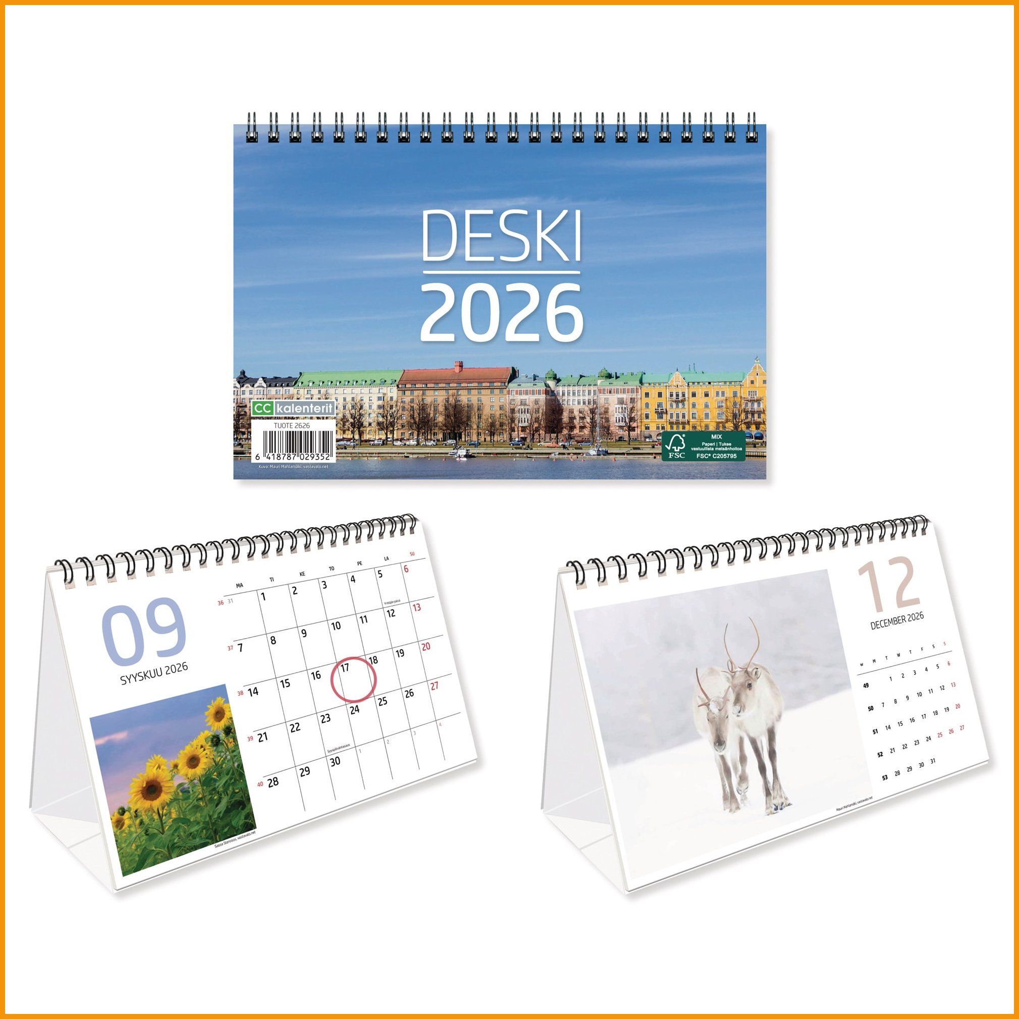 CC 2626 Deski 2026 – tyylikäs kuukausipöytäkalenteri CC 2626 Deski 2026 pöytäkalenteri on selkeä ja käytännöllinen ratkaisu työpöydälle. Sen riittävän suuri koko mahdollistaa sen, että näet yhdellä silmäyksellä koko kuukauden merkinnät ja aikataulut. Kalenteri sopii käytettäväksi erillisen telineen päällä ja on helppo sijoittaa toimistoon tai kotityöpisteeseen. Suomenkielisellä puolella on myös päiväkohtaista muistiinpanotilaa, mikä tekee arjen suunnittelusta entistä sujuvampaa. Kalenteri on kierresidottu ja sisältää siirrettävän päiväosoittimen, jonka avulla pysyt aina ajan tasalla. Kuukausikohtaiset kauniit kuvat piristävät työpäivää ja tuovat inspiraatiota arkeen. Lisäksi Deski 2026 on erinomainen liikelahja, sillä siihen voidaan painattaa yrityksen logo, jolloin se tarjoaa näkyvyyttä koko vuoden ajan. Tilaa Deski 2026 pöytäkalenteri netistä – meidän kalenteri verkkokauppa tarjoaa monipuolisen valikoiman vuoden 2026 kalentereita kaikkiin tarpeisiin. Huomioithan, että kalentereilla ei ole vaihto- eikä palautusoikeutta.Pöytäkalenteri 2026 Cc 2626 deski 210 x 140mm on tasokas kalenteritarvike, jonka verkkokaupan tilauksen toimitus kestää 1-2 päivää. Huomaa, että Toimitus on ilmainen kaikilla verkkokaupan ostoksilla, joiden hinta on yli 140 €. Meiltä voit tilata laskulla ja ilman rekisteröitymistä.
