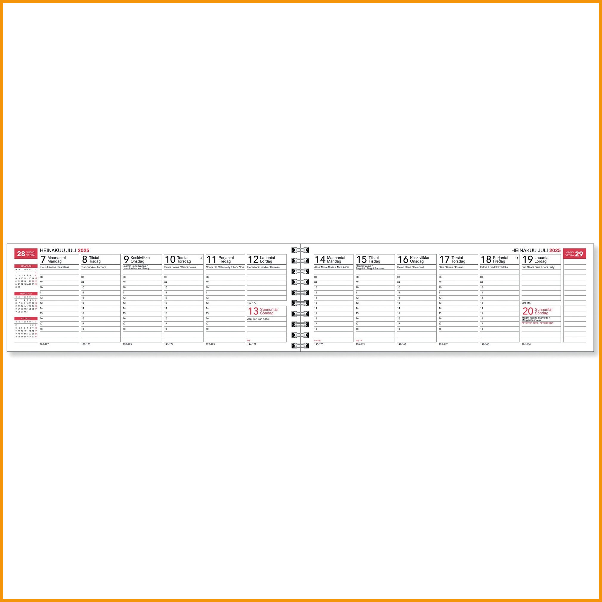 Ympäristöystävällinen FSC sertifioitu pöytäkalenteri. Pöytäkalenterin arkit ovat kirkkaan valkoisia ja kartonkisen kannen väri on oranssi. Kalenterin arkit on sidottu kaksoiskierteellä. Pöytäkalenterin koko on 225 x 95 mm. Kalenterissa on yhdellä sivulla yksi viikko. Kellonajat on pöytäkalenterissa esitetty 1 tunnin välein.Pöytäkalenterit ja päiväkirjat tuotteiden toimitustiedot
