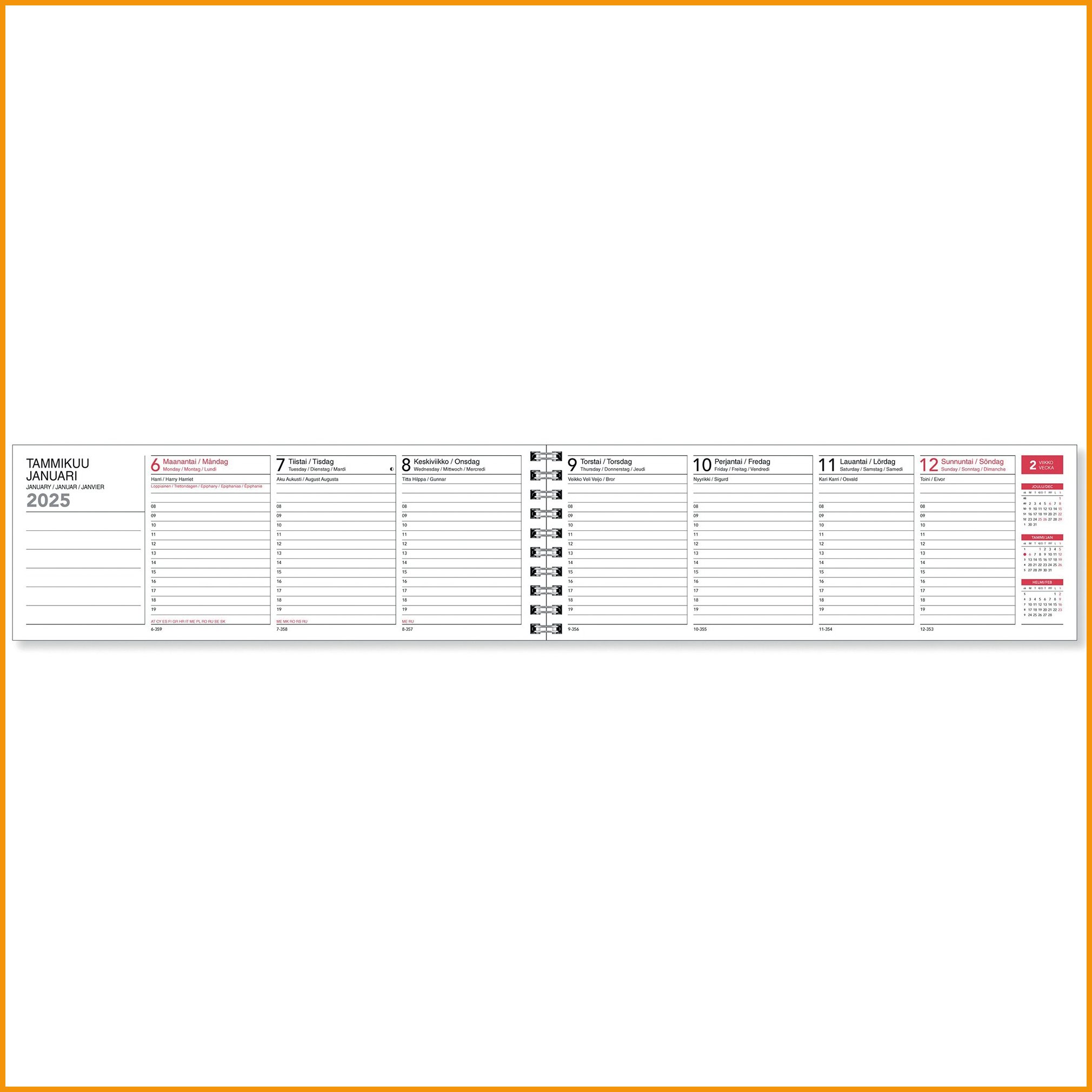 CC 3306 Protime Europa eko 2026 – viisikielinen pöytäkalenteri CC 3306 Protime Europa eko 2026 pöytäkalenteri on selkeä ja käytännöllinen ratkaisu kansainväliseen työympäristöön. Kalenterissa on viisi kieltä – suomi, ruotsi, englanti, saksa ja ranska – mikä tekee siitä erinomaisen työkalun monikielisissä toimistoissa ja organisaatioissa. Aukeamalla näkyy aina yksi viikko, ja päivän aikataulut on merkitty klo 8–19 myös viikonloppuisin, mikä helpottaa tarkkaa ajanhallintaa. Kalenterin toisella laidalla on muistiinpanotilaa ja toisella kolmen kuukauden kuukausiseuranta, joka tukee sekä arjen että pitkän aikavälin suunnittelua. Protime Europa eko sisältää viikot 50/2025–1/2027, vuosisuunnitelmat vuosille 2026 ja 2027 sekä vuosikalenterit vuoteen 2030 asti. Liputuspäivät, kansalliset pyhät ja nimipäivät täydentävät kokonaisuuden. Kierresidonta takaa helpon käytön, ja kartonkikannet tekevät kalenterista kestävän. Tilaa Protime Europa eko 2026 pöytäkalenteri netistä helposti ja varmista, että pysyt aikatauluissa koko vuoden. Huomioithan, että kalentereilla ei ole vaihto- eikä palautusoikeutta.Pöytäkalenteri 2026 Cc 3306 protime europa eko 255 x 95mm on korkeatasoinen kalenteritarvike, jonka toimituksen kesto on verkkokaupasta tilattuna 1-2 päivää. Huomaa, että ilmainen toimitus on kaikilla yli 140 € hintaisilla tilauksilla! Meiltä voit tilata laskulla ja ilman rekisteröitymistä.