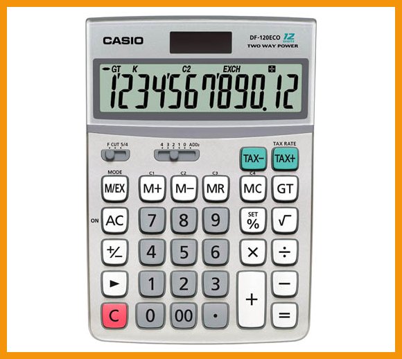 Casio DF-120ECO on kierrätysmuovista valmistettu pöytälaskin 12 numeron näytöllä. Myös pakkaus ja käyttöohjeet on valmistettu kierrätysmateriaalista. Laitteessa on vero-, valuutta- (3 kurssin tallennus), neliöjuuri- prosenttilaskentatoiminnot, 00-näppäin ja 7-toiminen %-näppäin. Valokennolla toimivassa laskimessa on paristovarmennus (LR44).Mitat: 35,7 x 122 x 174,5 mm, paino 180 g