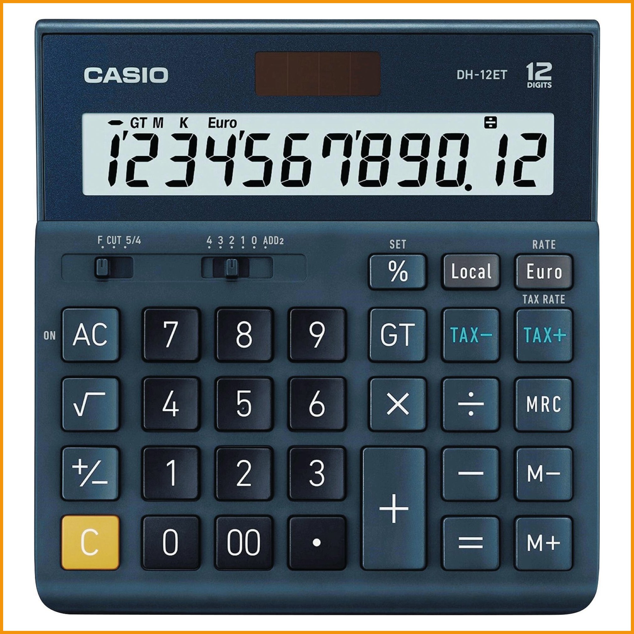 Casio dh-12et -pöytälaskimessa on suuri 12 numeron näyttö ja ergonomiset näppäimet. pohjan kumitassut pitävät laskimen hyvin paikallaan. valokennolla toimivassa laskimessa on paristovarmennus. Pöytälaskimen mitat ovat: 15,1 x 15,9 x 2,9 cm, paino 180 g. näytön mitat: 12,4 x 2,8 cm.Pöytälaskin Casio dh-12et 12 numeroa on erinomainen laskin, jonka verkkokaupan tilauksen toimitus kestää 1-2 päivää. Tiedäthän, että toimitus on ilmainen yli 140 € hintaisille verkkokauppa ostoksille! Meiltä voit tilata laskulla ja ilman rekisteröitymistä.