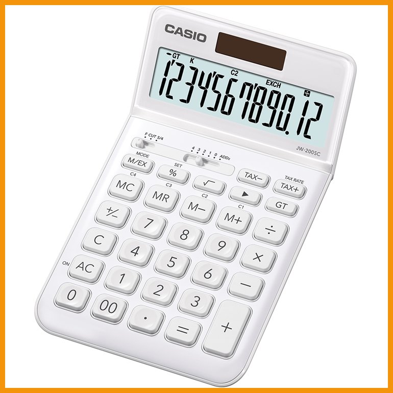 Casio JW-200SC-WE -pöytälaskimessa on suuri 12 numeron taittuva näyttö ja vankka metallikuori. Laskimella onnistuvat niin peruslaskutoimitukset kuin verolaskenta (TAX+, TAX-), neliöjuuri, valuuttamuunnokset sekä prosentti- ja katelaskenta. Laskimessa on myös muisti (MC, MR ,M-,M+), etumerkinvaihtonäppäin (+/-), tuhatlukuerotin, 00-näppäin, kokonaisummamuisti (GT), desimaalien säätö (0,1,2,3,4,ADD2) ja pyöristystavan valinta (F,CUT,5/4). Valokennolla toimiva laskin on paristovarmennettu (LR-1130)Mitat: 11 x 109 x 184 mm, paino 150 g