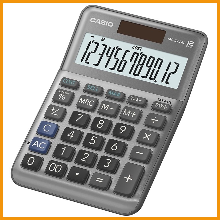 Casio MS-120FM on metallikuorinen pöytälaskin, jossa on iso 12 numeron näyttö. Peruslaskutoimitusten lisäksi laskin hallitsee seuraavat toiminnot: riippumaton muisti, vero-, kate- ja valuuttalaskenta ja hinnoittelulaskenta (COST, SELL, MAR). Laitteessa on ±-näppäin, 00-näppäin, pikakorjausnäppäin ja 7-toiminen %-näppäin. Valokennolla toimivassa laskimessa on paristovarmennus.Mitat: 31 x 103 x 145 mm, paino 120 g