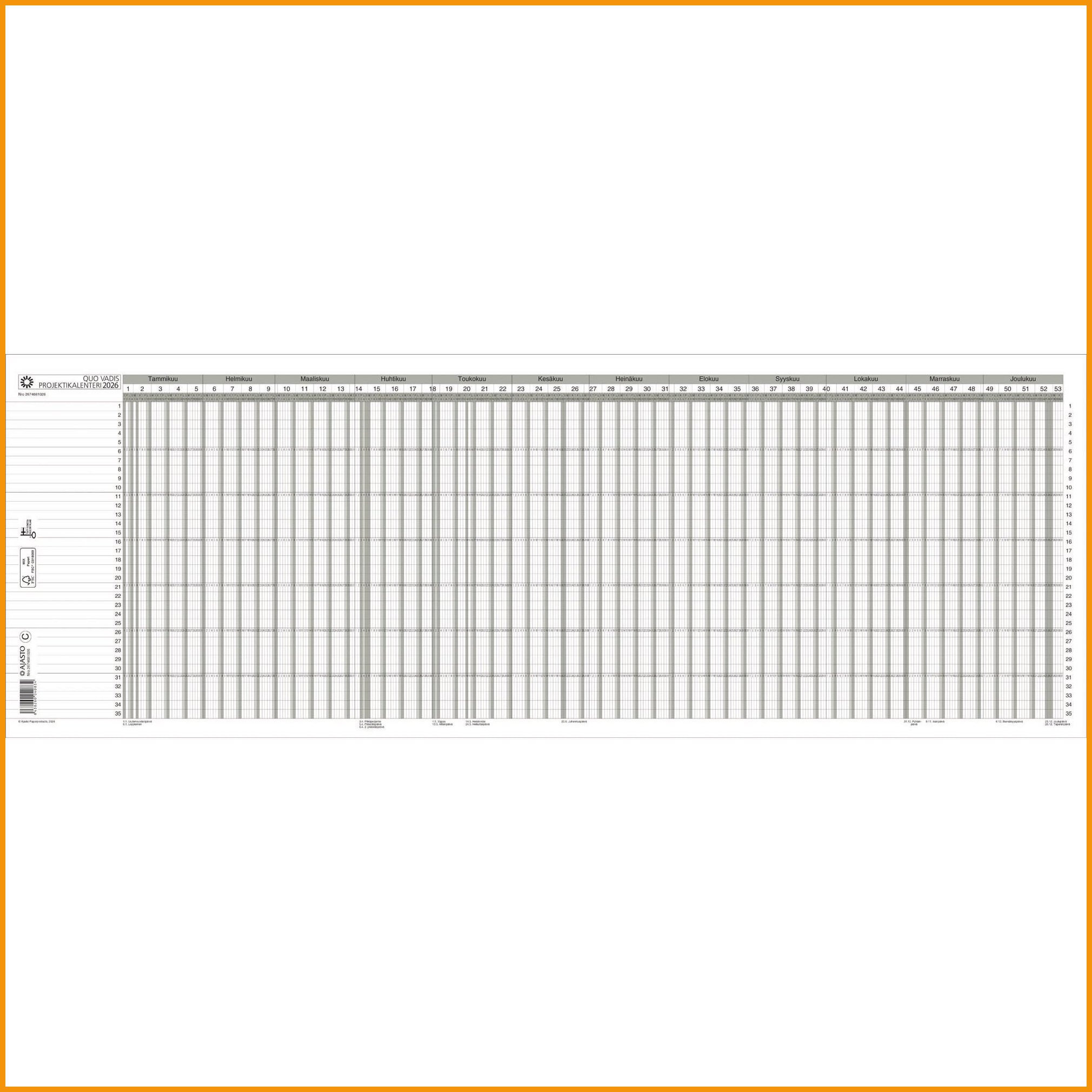 Ajasto Quo Vadis Projektikalenteri 2026 on tehokas apuri erilaiseen projektisuunnitteluun. Kalenterin ollessa auki, näet selkeässä taulukkonäkymässä koko vuoden kuukaudet rinnakkain, myös viikko- ja päiväjaotuksen. Erilaisille kalenteriin vietäville tehtäville on kalenterin reunassa reilusti viivoitettua tilaa. Ajasto Quo Vadis Projektikalenteri 2026 tärkeimmät ominaisuudet: koko 837 x 297 mm, taitettuna A4 suunnittelukalenteri, jossa koko vuosi kerralla nähtävissä kuukaudet rinnakkain, myös viikko- ja päiväjaotus tehtäville ja toimenpiteille rivit allekkain FSC®-sertifioitu tuote Ajasto-kalenterit ovat pääosin kotimaista tuotantoa. Kalentereiden suunnittelussa muiden muassa ekologisuus ja laatu ovat tärkeässä asemassa. Ajasto Quo Vadis Projektikalenteri 2026 painetaan sertifioidulle paperille. Sertifioidulla FSC-paperilla olet mukana edistämässä vastuullista metsänhoitoa. Kalentereilla ei ole vaihto- eikä palautusoikeutta.