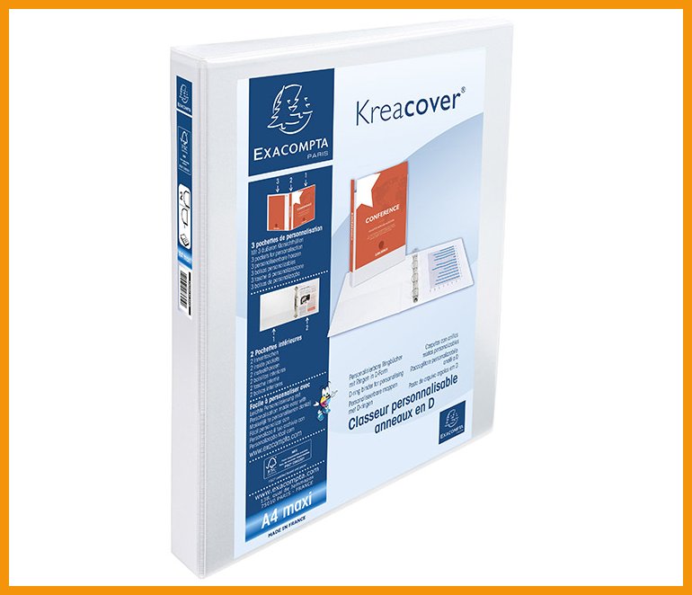 Exacompta Kreacover -projektikansio on varustettu monipuolisilla taskuilla: sekä etu- että takakannessa on täysikokoiset taskut, selkämyksessä on tasku ja myös kansion sisäpuolella on tasku irtopapereille. Vankka kaksirenkainen D-mekanismi pitää paperinipun ojennuksessa. Kansio on valmistettu FSC Mix -sertifioidusta materiaalista ja pinnoitettu PP-muovilla.Koko: A4