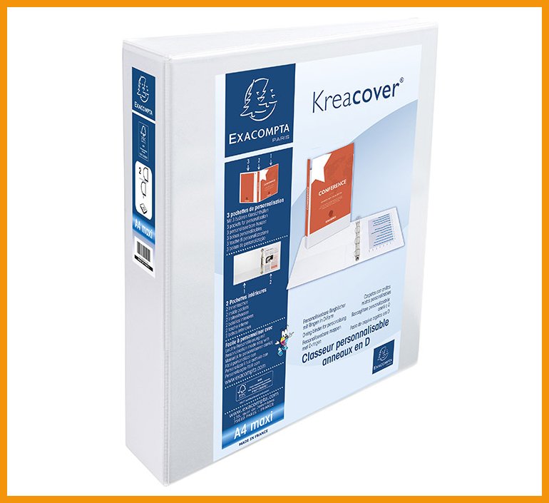 Exacompta Kreacover -projektikansio on varustettu monipuolisilla taskuilla: sekä etu- että takakannessa on täysikokoiset taskut, selkämyksessä on tasku ja myös kansion sisäpuolella on tasku irtopapereille. Vankka kaksirenkainen D-mekanismi pitää paperinipun ojennuksessa. Kansio on valmistettu FSC Mix -sertifioidusta materiaalista ja pinnoitettu PP-muovilla.Koko: A4