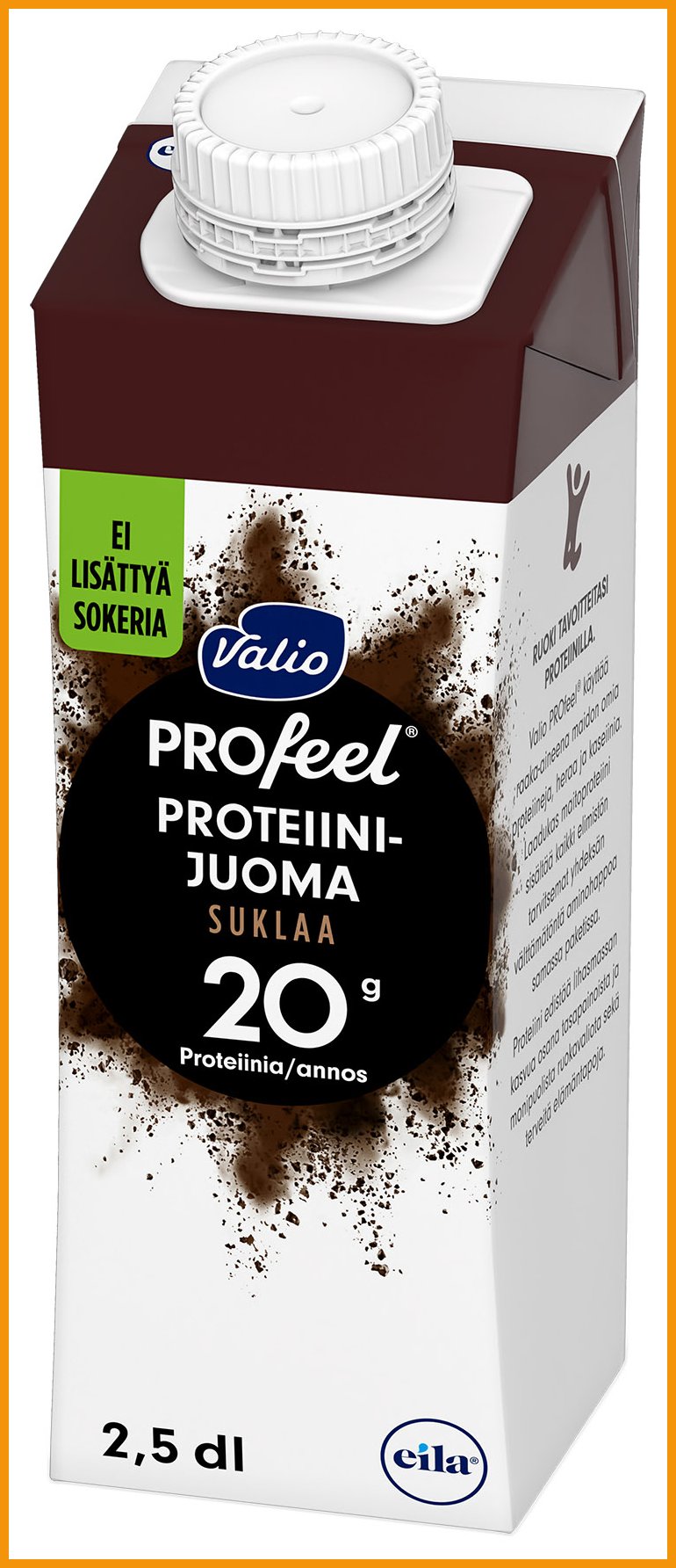 Valio PROfeel Suklaa -proteiinijuoma sopii niin välipalaksi kuin kovankin treenin yhteyteen. Juoma sisältää kaikki elimistön tarvitsemat aminohapot ja 20 grammaa maitoproteiinia yhdessä paketissa. Ei lisättyä sokeria. Katso tarkempi tuoteseloste Seloste-välilehdeltä.Sisältö: 2,5 dl