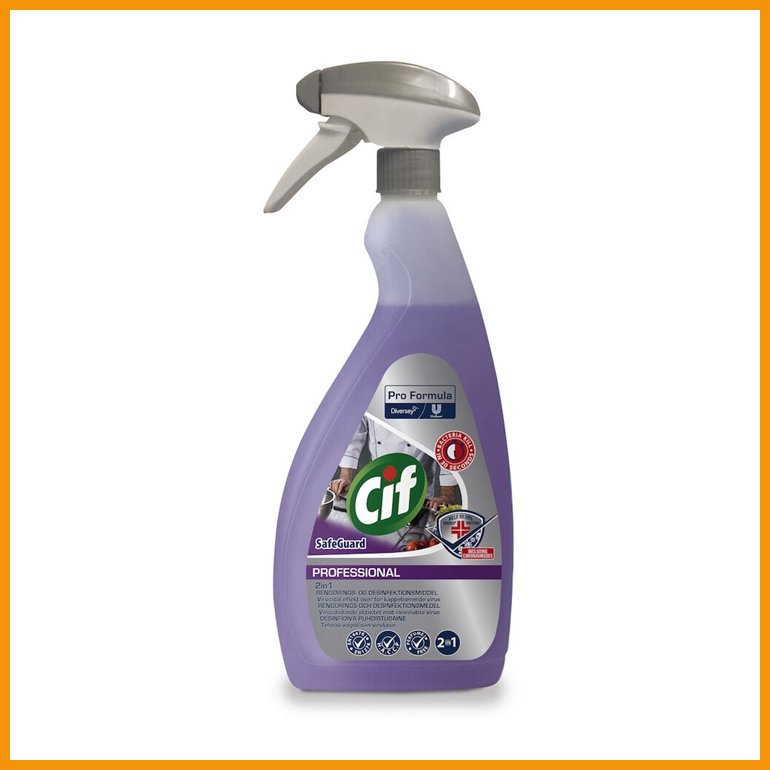 Cif Pro Formula Safeguard 2in1 on käyttövalmis desinfiointiaine vettä sietävien pintojen samanaikaiseen pesuun ja desinfiointiin. Se sopii elintarvikkeiden kanssa kosketuksissa olevien pintojen ja laitteiden desinfiointiin. Rasvaa ja kiinni kuivunutta likaa irrottava aine tehoaa myös mikro-organismeihin kaikenlaisissa vesiolosuhteissa.Tuote annostellaan puhdistettavalle pinnalle, pestään puhtaaksi pyyhkeellä tai sienellä ja lopuksi huuhdellaan puhtaalla vedellä. Aine tappaa 99,99 % bakteereista ja vaipallisista viruksista, kuten koronan.