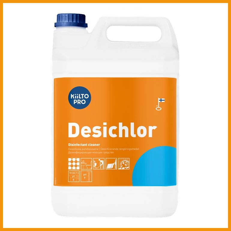 Kiilto Pro Desichlor on Kloramiini T -pohjainen puhdistusaine kaikkien vettä sietävien (myös vahattujen) pintojen desinfioivaan puhdistukseen. Heikosti emäksinen ja hajusteeton, myös eritetahradesinfektioon soveltuva tuote poistaa pahat hajut eikä vaurioita pintamateriaaleja.Pakkauskoko: 5 litraa