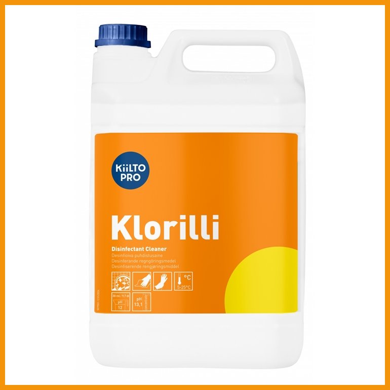 Kiilto Pro Klorilli on ammattikäyttöön tarkoitettu hajuton ja desinfioiva puhdistusaine laajakirjoisella desinfektioteholla ja erinomaisella lianirrotuskyvyllä. Kloramin T -pohjainen biosidivalmiste on omiaan sekä desinfioivaan puhdistukseen että eritetahradesinfektioon.Aineen sisältämä orgaaninen klooriyhdiste tuhoaa tehokkaasti bakteereja, viruksia ja sieniä (EN 13727 (bakteerit), EN 13624 (hiivat), EN 13697 (bakteerit ja fungit), EN 14476 (polio-, adeno- ja norovirus) - täysi virusidinen teho).