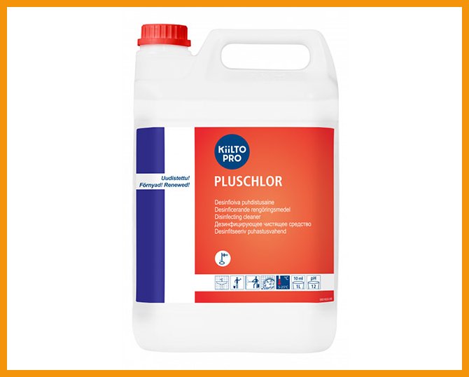 Kiilto Pro Pluschlor on natriumhypokloriittia sisältävä desinfioiva ja valkaiseva puhdistusaine emäksiä sietävien pintojen desinfioivaan puhdistukseen ja valkaisuun. Myös eritetahradesinfektioon soveltuva tuote on tarkoitettu erityisesti kosteiden tilojen, kuten pesuhuoneiden, saniteettitilojen, uimahallien ja kylpylöiden desinfioivaan puhdistukseen. Voimakkaasti emäksisellä tuotteella on erinomainen puhdistusteho.Monipuolinen aine sekä desinfioi ja valkaisee että poistaa hajuja ja rasvalikaa. Tuotetta voidaan levittää käsimenetelmien lisäksi myös vaahdotuslaitteella. Nopeavaikutteiset ja laajakirjoiset klooriyhdisteet toimivat hyvin niin bakteereita, itiöitä ja viruksia kuin hiivoja ja homeitakin vastaan (EN 13697).