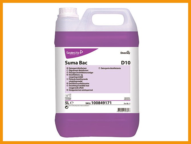 Suma Bac D10 on desinfioiva puhdistusaine ruoanvalmistustilojen kaikkien pintojen tehokkaaseen pesuun ja desinfiointiin. Kvaternaarista ammoniumyhdistettä sekä kompleksoivia ja puskuroivia aineita sisältävä aine tehoaa useimpiin mikro-organismeihin kaikissa veden kovuuksissa. Pinta-aktiiviset aineet tekevät puhdistamisesta tehokasta.Pakkauskoko: 5 litraa
